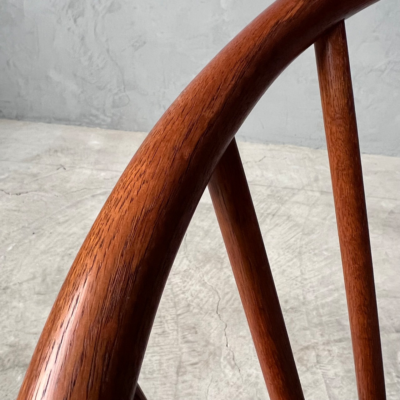 曲げ木家具においてはあまり見られないオーク材が使用されており、東欧の曲木家具のデザインを継承するモデルとは一線を画した、ジャパニーズモダン色が濃厚な逸品で、ファクトリーデザインながら海外の評価が非常に高く、高額で取引されている隠れた名作です。