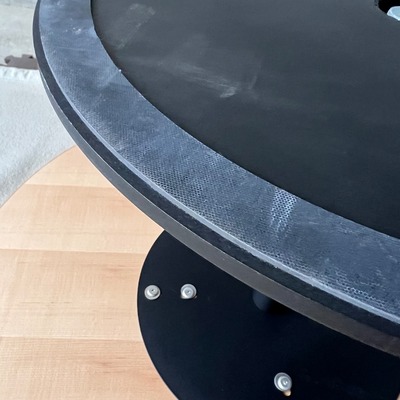 見かけによらず重量は約34キロと安定感がございますので、一本脚のラウンドテーブルですが小さなお子様がいらっしゃるご家庭でも安心してお使いいただけることと思われます。