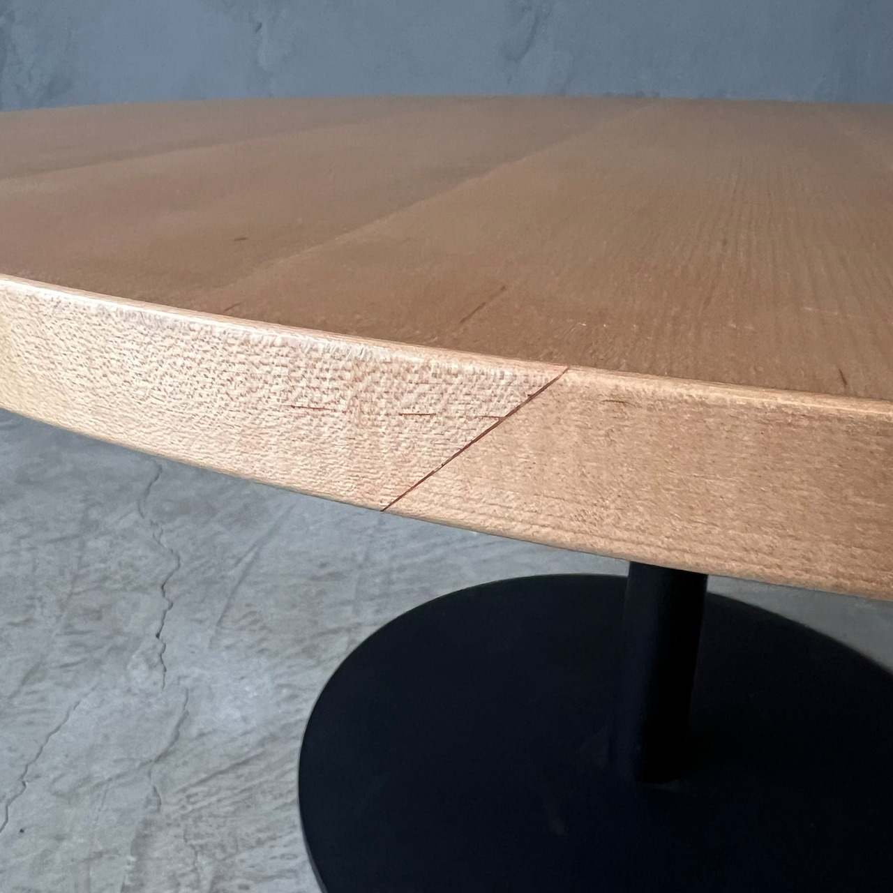 天板の素材、脚部カラーを選択できるシステムですが、こちらは天板がメイプル突板のウレタンクリア塗装、スチールの脚部がマットブラック、メリハリの効いたカラーリングが目を引く、シンプルながら存在感のあるミニマムデザインです。