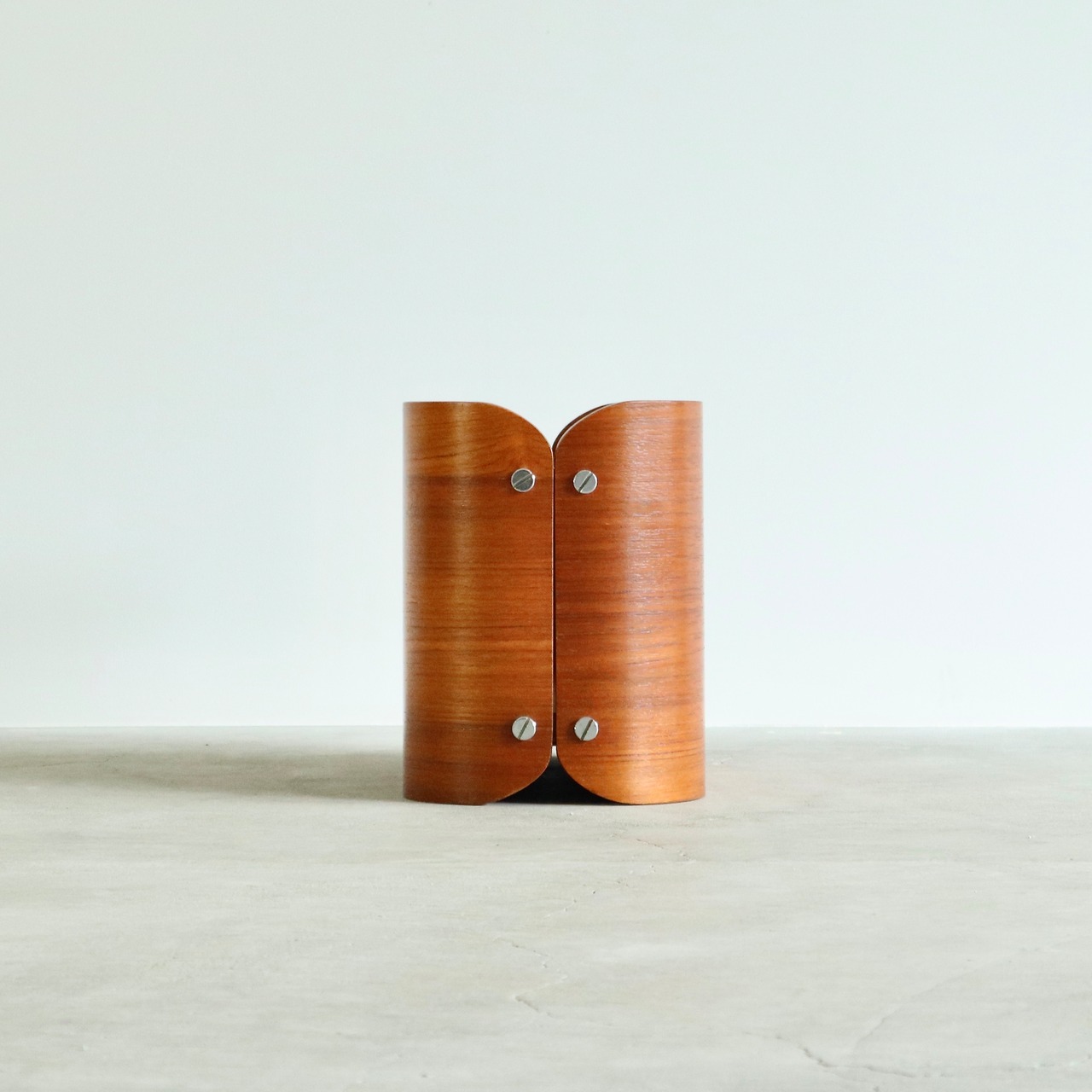 約9mm厚の2枚の成形合板を底板とステンレスのパイプで連結する特異な構造で、センターに入るスリットとサイドのマイナスヘッドパーツが意匠となりジャパニーズモダン感を際立たせます。