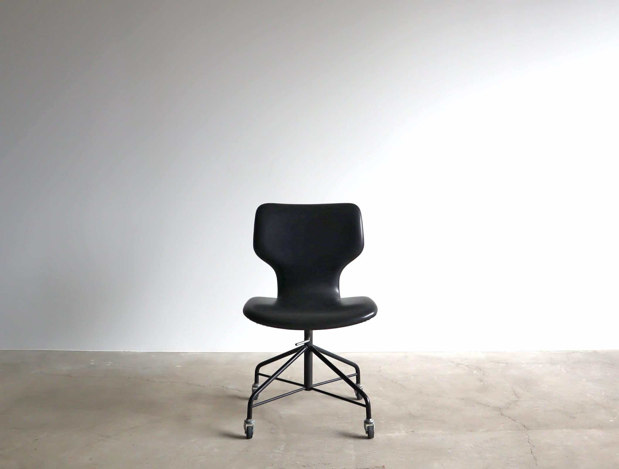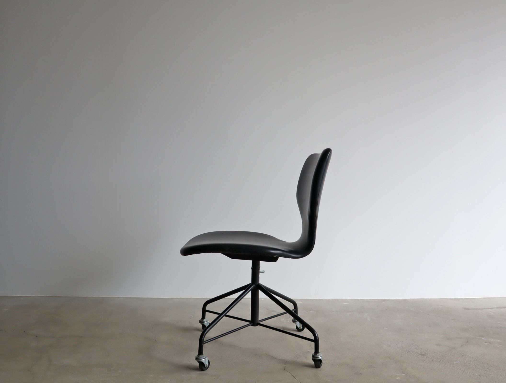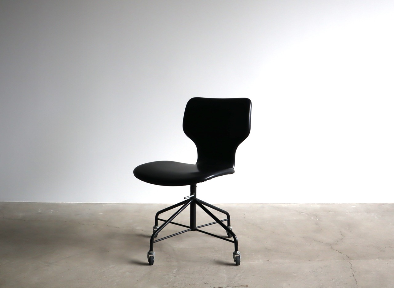 プライウッド独特のミニマムなシルエットにオールブラックのカラーリングは空間に凛としたほどよい緊張感を与えると同時に、ヴィンテージチェアならではのノスタルジックさを感じさせる経年変化の味わいが共存しつつも、合成皮革部分の状態が極めて良好な稀有な逸品。