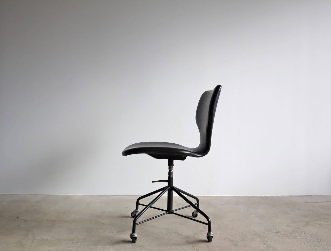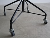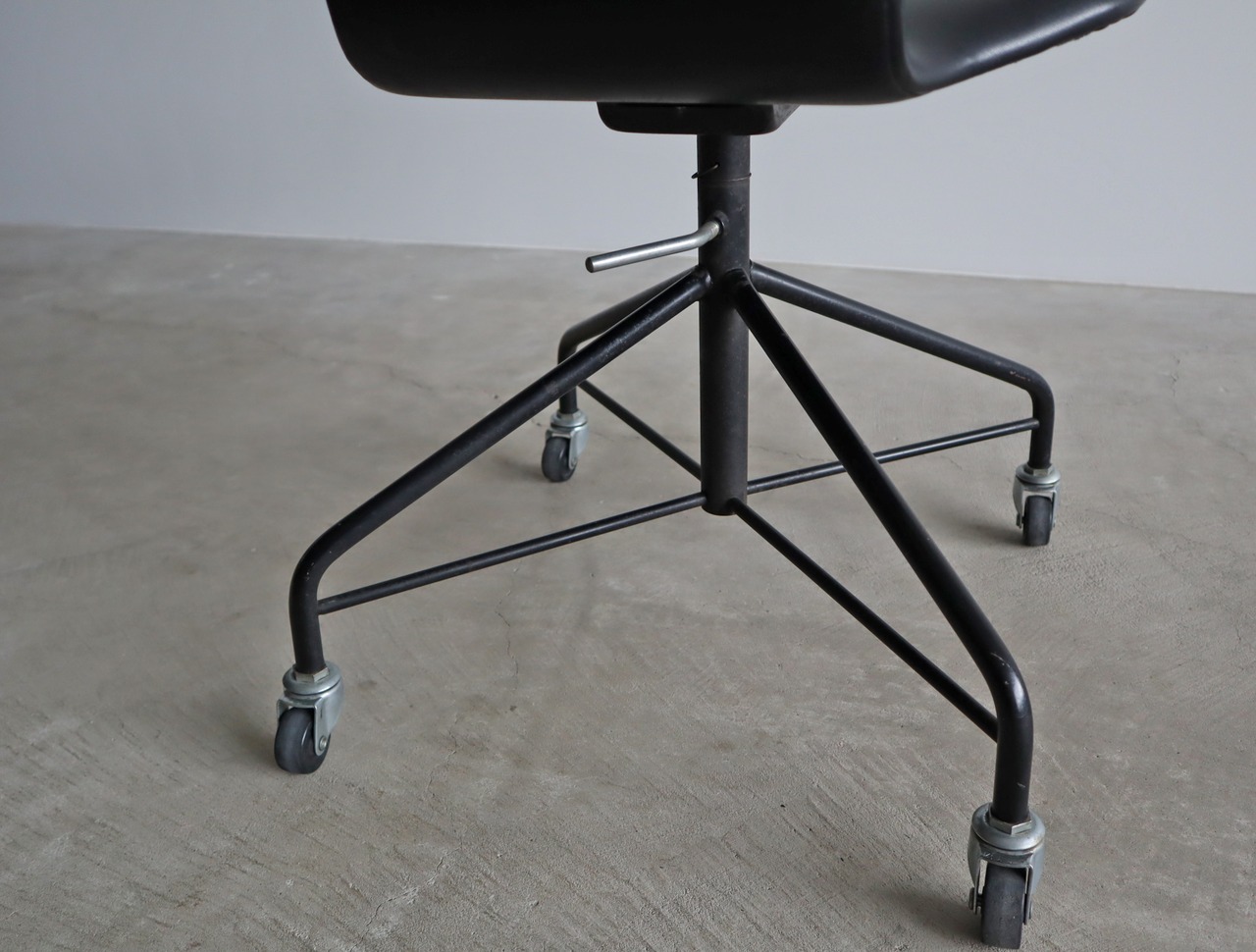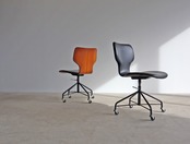 成形合板技術による一体型の背もたれと座面は、適度なしなりを保ちながらもからだに優しくフィットし、キャスター可動に加え360度回転式、支柱の溝にレバーを固定することで高さは3段階で変動、ファクトリーデザインながら国産ヴィンテージチェアとして人気を博す、実用度の高い隠れた名作です。