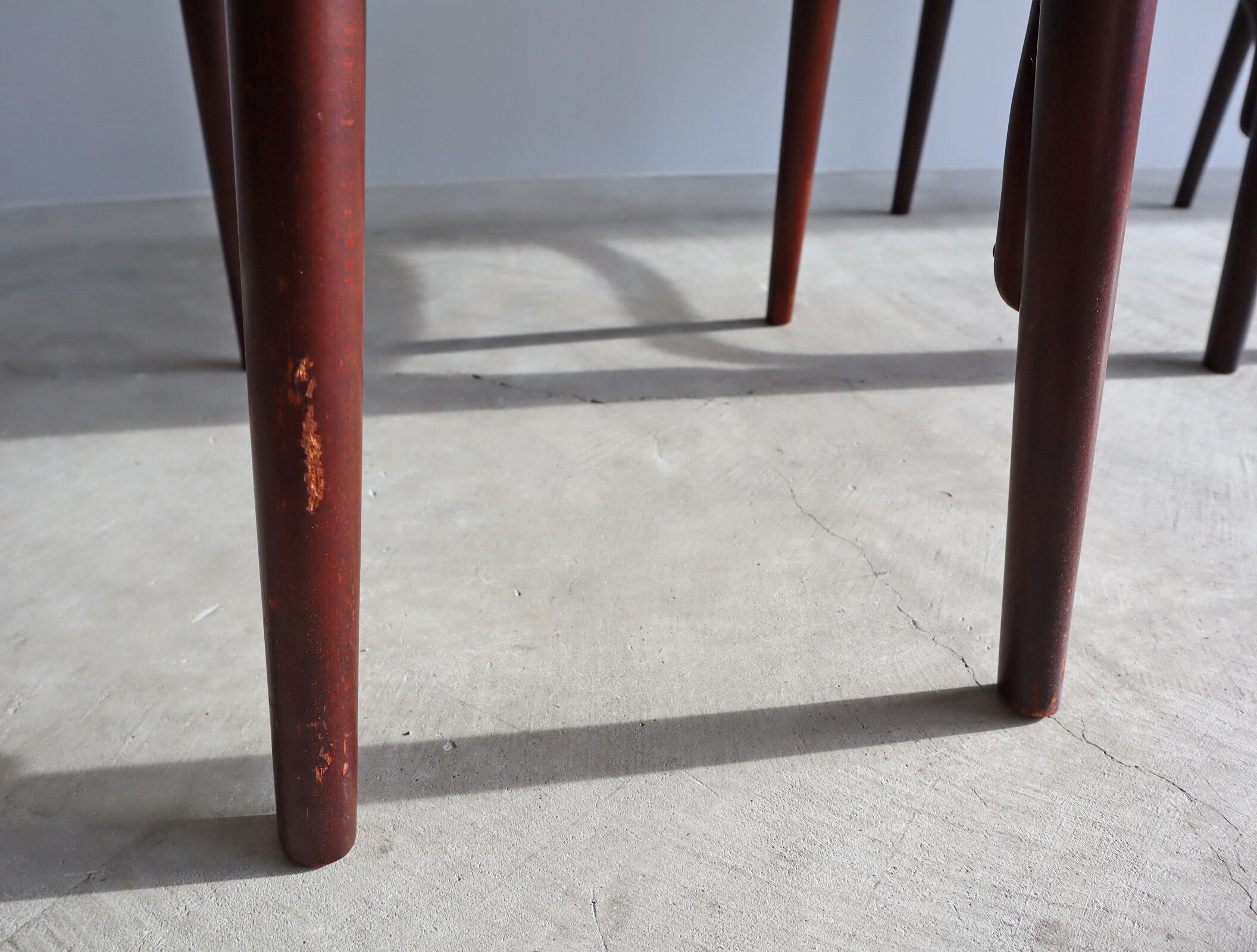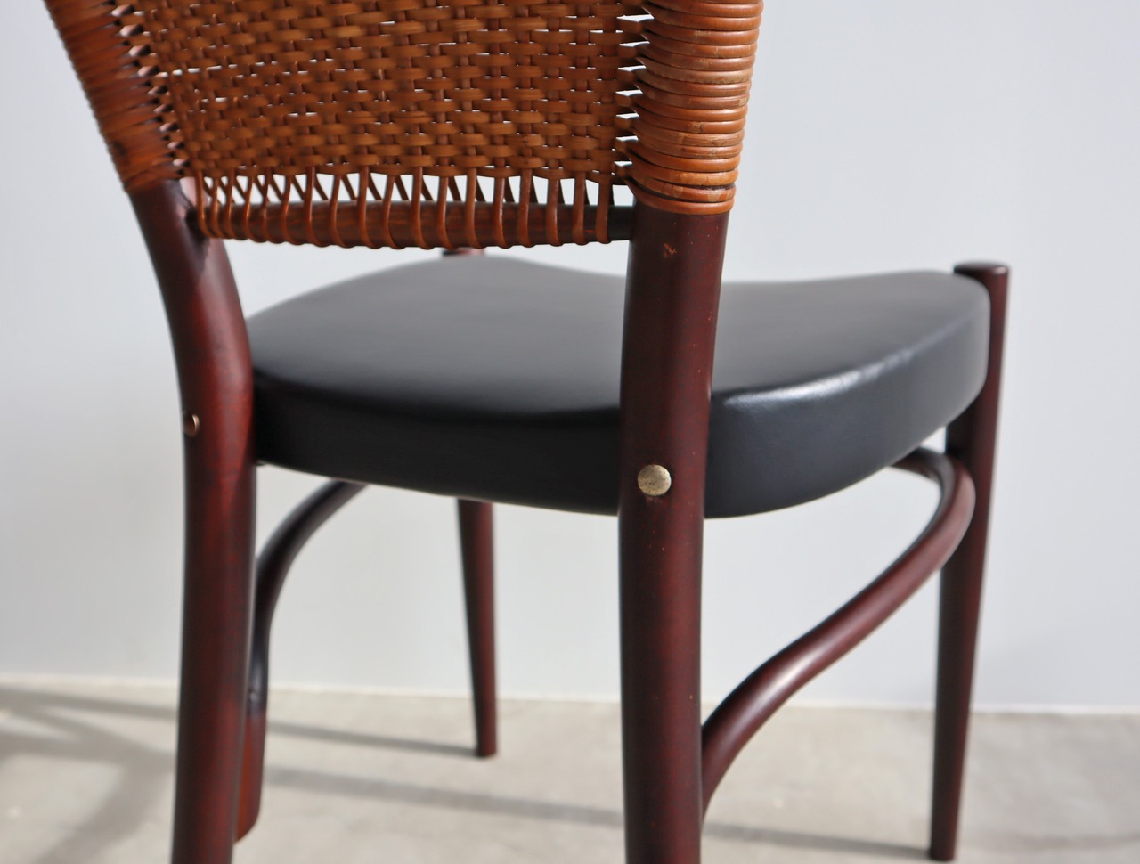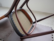 尻窄まりで比較的高めなバックレストに対しコンパクトな座面のコンビネーションは独特なシルエットを持ち、流麗なラインを描くストレッチャーと相まって、他の曲木椅子とは一線を画す特異な存在感を纏っております。