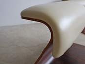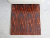 力強いローズウッドの板目がスリップマッチで配置された木目デザインは2点とも表裏共通で、プライウッド座椅子としては広めなフラット座面に湾曲した背もたれ、肉厚なクッションにふんぞり返るようなポジションで着座できる、座イスとしての実用度が高めのモデル。