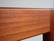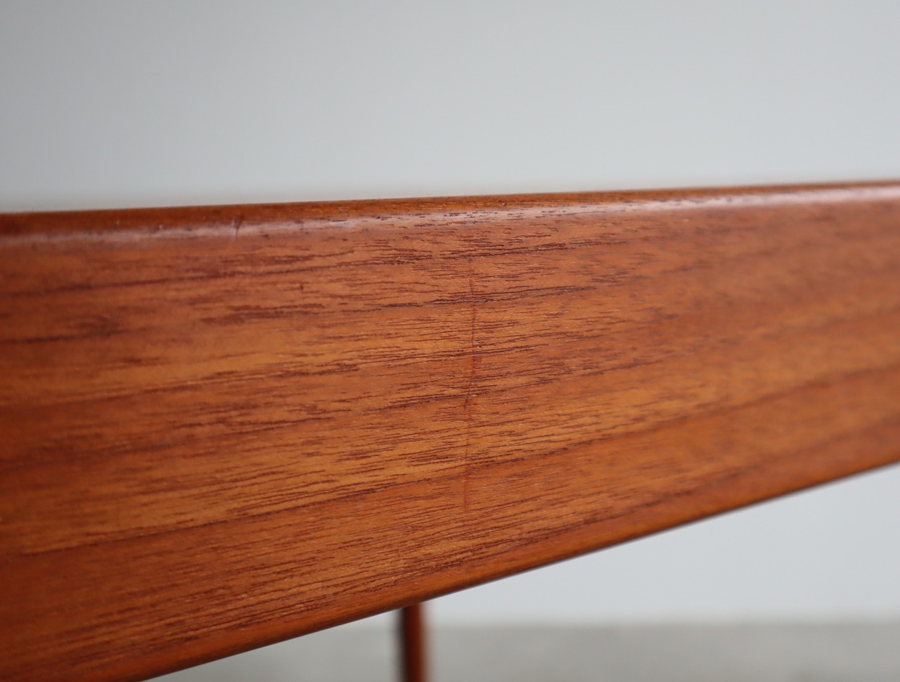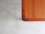 70年代の百貨店家具売り場にて輸入北欧家具と並び人気を博したこのモデルは、チーク材のあたたかな風合いに直線的ながら随所に丸みを帯びた細部のディティールというデザイン的な魅力もさることながら、当時の住宅事情、特に団地に適したコンパクトなサイズ感が大きな特徴となります。