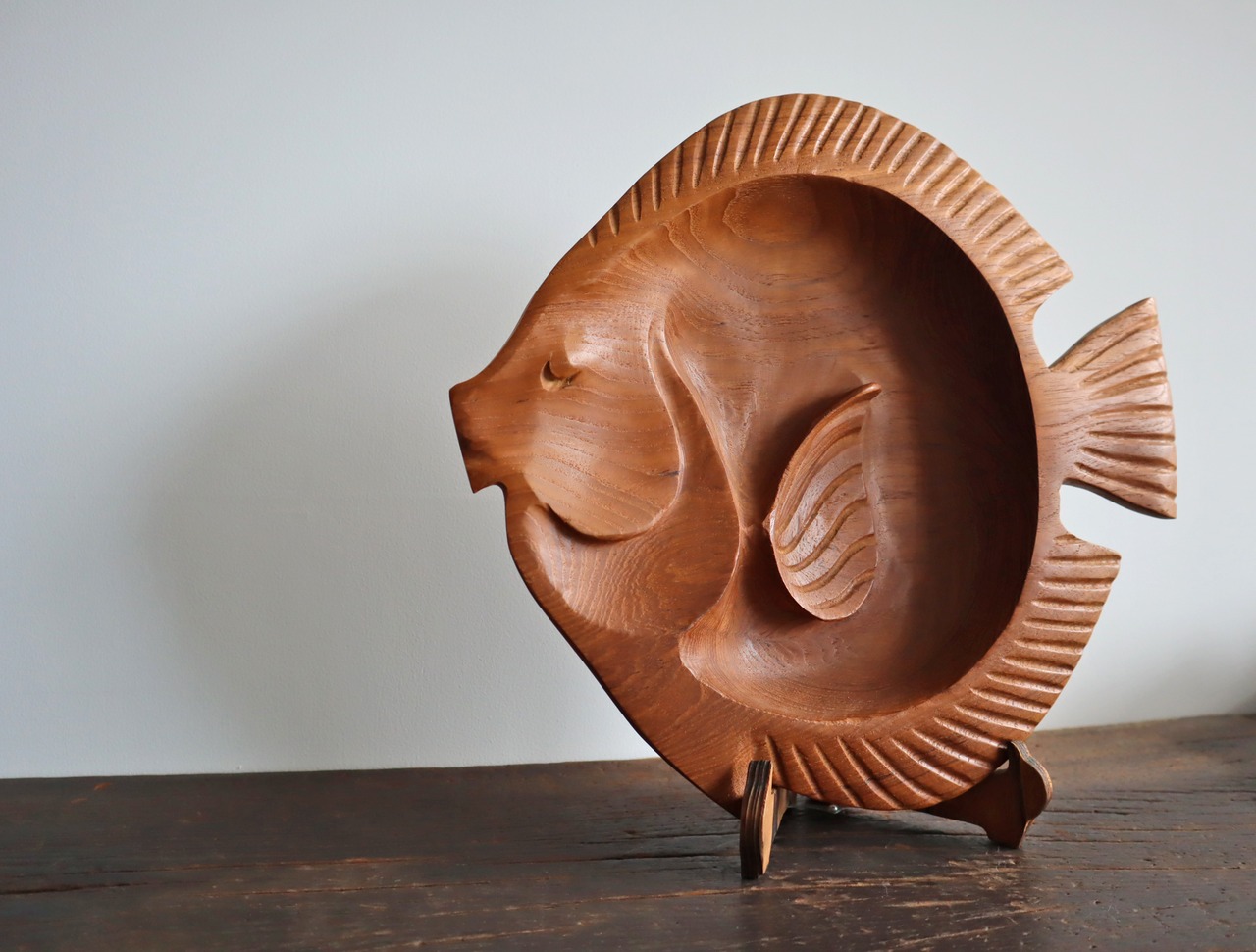 チーク材を手彫りした、ちょうちょう魚がモチーフと思われるプレート。
