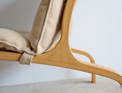 ビーチ材の成形合板に籐張りの軽量フレーム、ブルーノマットソンのモデルにコマ入れ技術をプラスしたようなデザインは背もたれトップに頭が乗るか乗らないか程度のミドルバックにくるみボタン留めのクッション仕様、ソファというよりはラフにお使いいただけるラウンジチェアスタイルですが、安楽度は非常に高いです。