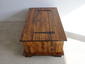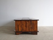 カバ材を使用したこちらのコーヒーテーブルは天板を開くとブランケットボックスとなり、フロントには12杯の小引き出しが付属、ソファに対するセンターテーブルでありながら、見せたくないものが一気に片付く大容量の収納ボックスとして活躍いたします。