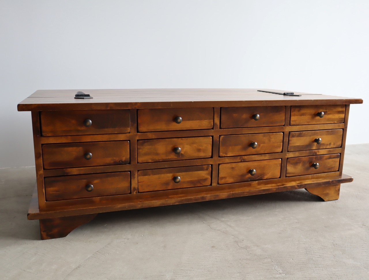 元々古めかしく見えるようなデザインではありますが、天板の擦り傷や下部角の傷等、実用による使用感もございますので画像にてご確認ください。