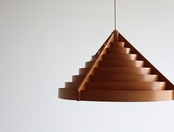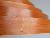 北欧の名作照明 「ヤコブソンランプ」を意識した、スライスしたパイン材のリングが重なり合うデザインながら、本家のどのモデルとも違った表情を見せるオリジナリティを持ち合わせた国産ヴィンテージです。